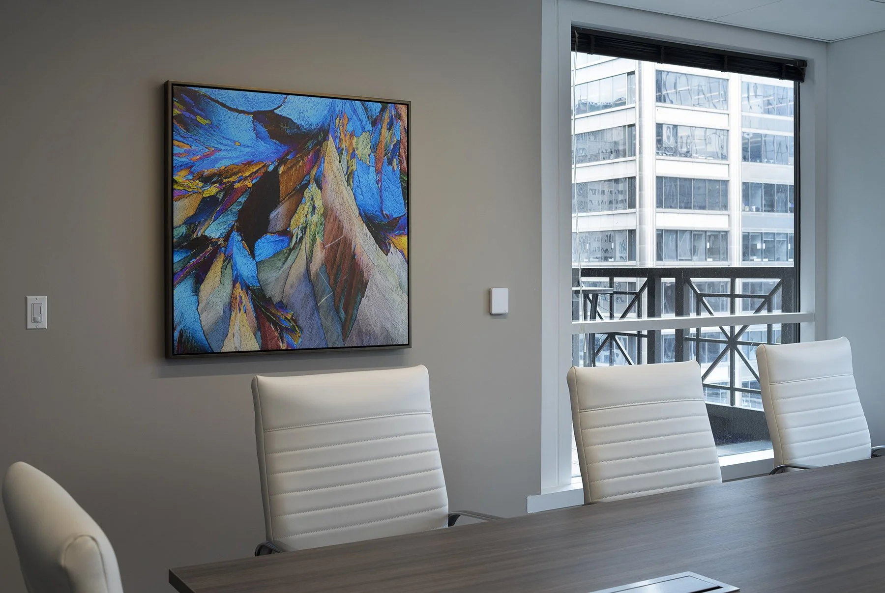 Throughout the office, the art collection comprises a mix of mediums, including photographic prints on specialty substrates and giclée prints on canvas and paper. Each piece was thoughtfully selected to foster an environment of warmth, inspiration, and professional optimism, ensuring that both employees and visitors feel welcomed and engaged.
