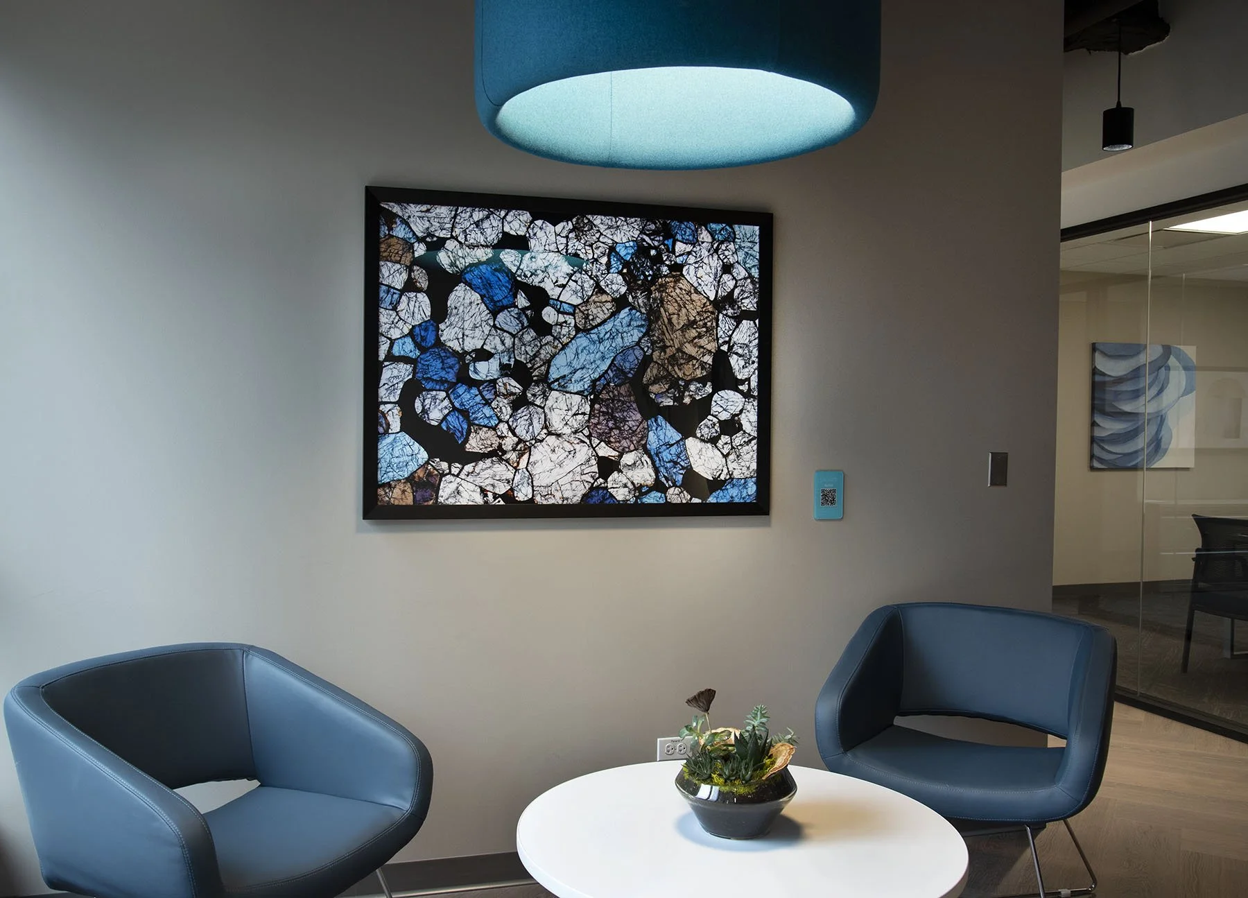 A highlight of the art program is the reception area, where a custom triptych by local artist Heather Hancock takes center stage. Featuring layered materials and vibrant textures, the piece offers a contemporary interpretation of the company's logo, serving as a visual testament to their brand identity.